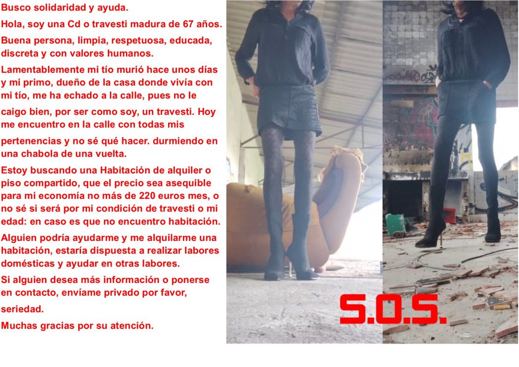 Lamentablemente mi tío murió hace unos días y mi primo, dueño de la casa donde vivía con mi tío, me ha echado a la calle, pues no le caigo bien, por ser como soy, un travesti. Hoy me encuentro en la calle con todas mis pertenencias y no sé qué hacer.